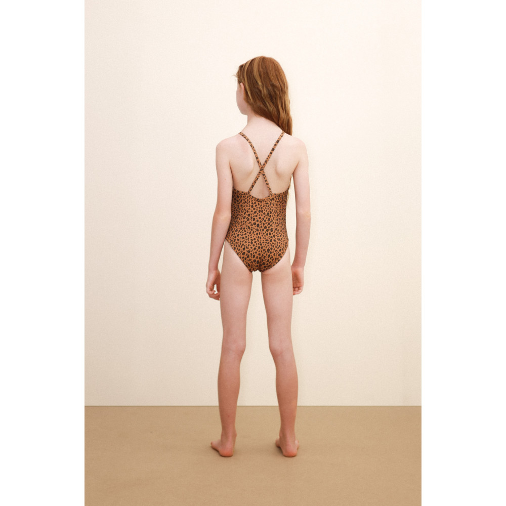 Додайте грайливого відтінку літа з цим купальником на бретельках, виготовленим з м’якої, еластичної тканини для максимального комфорту. З нашим мініатюрним тваринним принтом на світло-коричневій основі та гладким дизайном спереду, він пропонує сучасний та чарівний вигляд — ідеально підходить для сонячних днів.