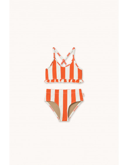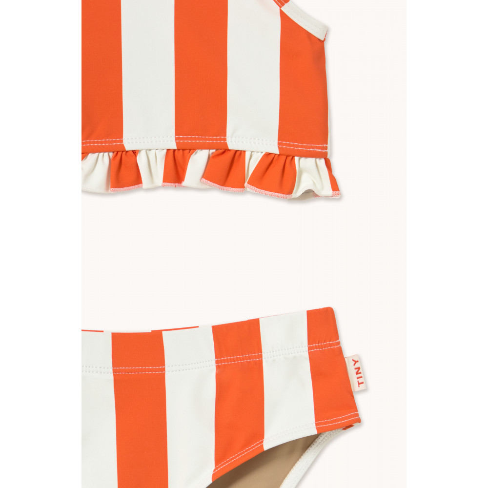 Цей двокомпонентний купальний комплект із червоним принтом у смужку поєднує в собі комфорт, стиль та грайливий акцент. Він має верх на бретельках із перехресною спинкою та рюшами по низу, а також низ у тон з еластичним поясом для комфортної та надійної посадки. Виготовлений з еластичної тканини, що швидко висихає, він забезпечує повну свободу рухів, що робить його практичним та чарівним вибором для сонячних днів та водних розваг.