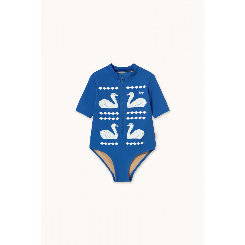 Цей купальник з короткими рукавами та принтом «Лебеді» на синій основі забезпечує комфорт, свободу рухів та стильний вигляд. Виготовлений з еластичної тканини, що швидко висихає, він має дизайн з імітацією горловини та передню блискавку для легкого одягання та перевдягання. Ідеально підходить для вільного руху у воді, це практичний та стильний вибір для сонячних днів.