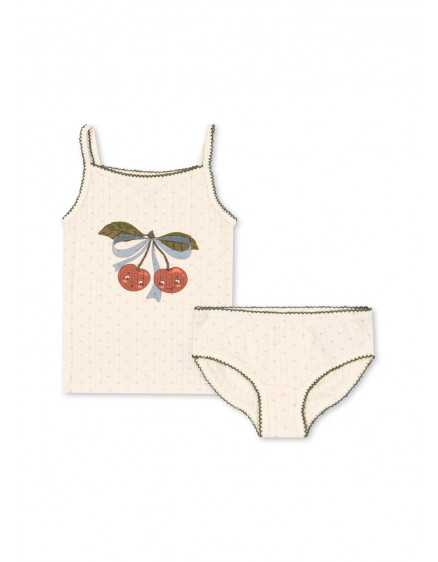 М'який комплект спідньої білизни з двох предметів: топ на бретельках та трусики, виготовлений зі 100% органічної бавовни. Minnie — це наша класична лінійка базових речей, виготовлених з м'якої органічної бавовни. Ці речі призначені для носіння як вдень, так і вночі як комфортний шар, щільно прилягаючий до шкіри, та мають декоративний візерунок пуантель по всій поверхні та краї піко.