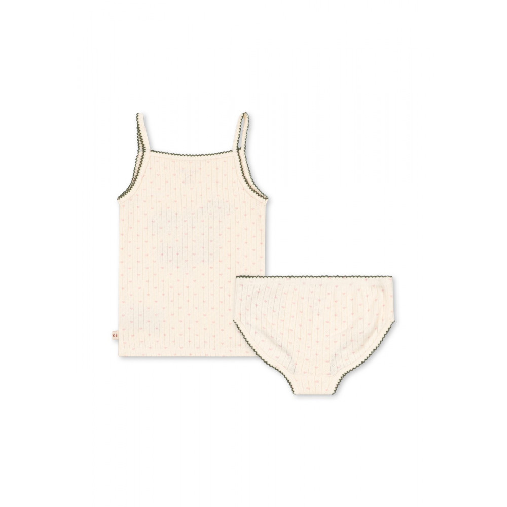 М'який комплект спідньої білизни з двох предметів: топ на бретельках та трусики, виготовлений зі 100% органічної бавовни. Minnie — це наша класична лінійка базових речей, виготовлених з м'якої органічної бавовни. Ці речі призначені для носіння як вдень, так і вночі як комфортний шар, щільно прилягаючий до шкіри, та мають декоративний візерунок пуантель по всій поверхні та краї піко.