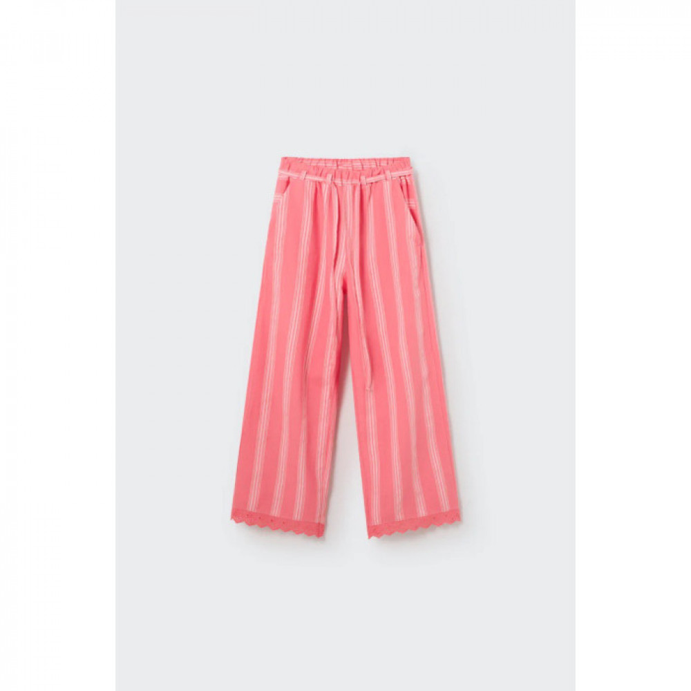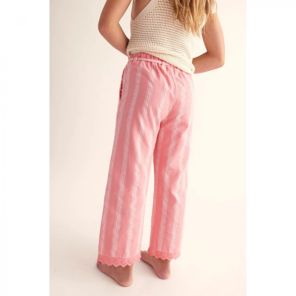 Штани в смужку для дівчинки з дуже м'якої бавовни. Еластичний пояс із шлевками та регульованим шнурком. Мереживо по краях.