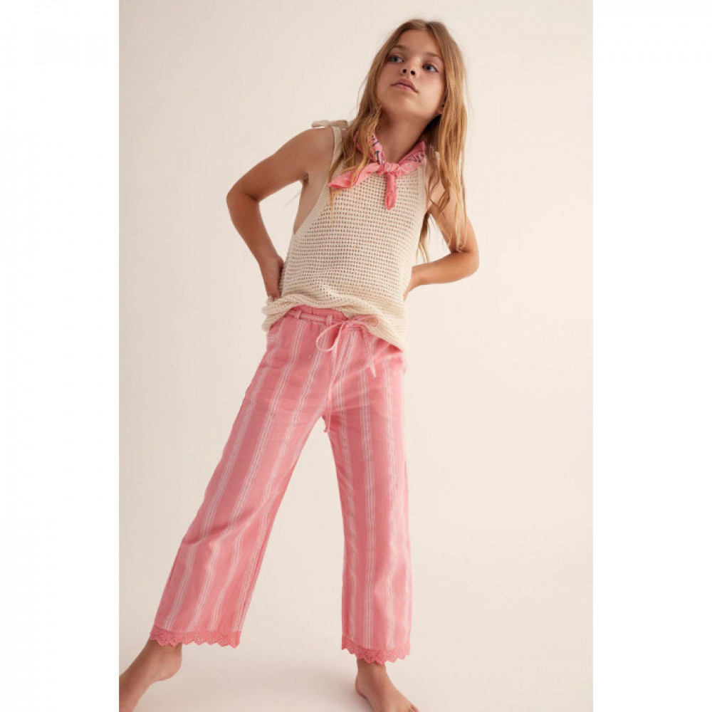 Штани в смужку для дівчинки з дуже м'якої бавовни. Еластичний пояс із шлевками та регульованим шнурком. Мереживо по краях.