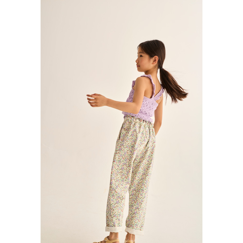 Штани з м'якої та повітряної бавовняної саржі. Еластичний регульований пояс з декоративною застібкою-ґудзиком. Імітація ширинки. Бічні кишені. Яскравий квітковий принт по всій поверхні.