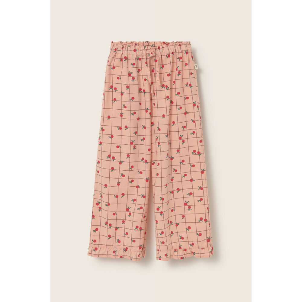 Широкі штани до щиколотки з легкого бавовняного попліну з веселим фруктовим принтом та ніжною текстурою «слаб». Еластичний пояс з рюшами та регульованим шнурком. Низ з рюшами.
