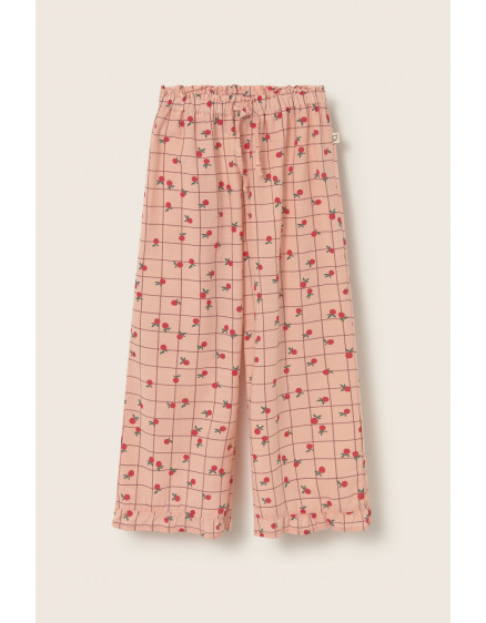 Широкі штани до щиколотки з легкого бавовняного попліну з веселим фруктовим принтом та ніжною текстурою «слаб». Еластичний пояс з рюшами та регульованим шнурком. Низ з рюшами.
