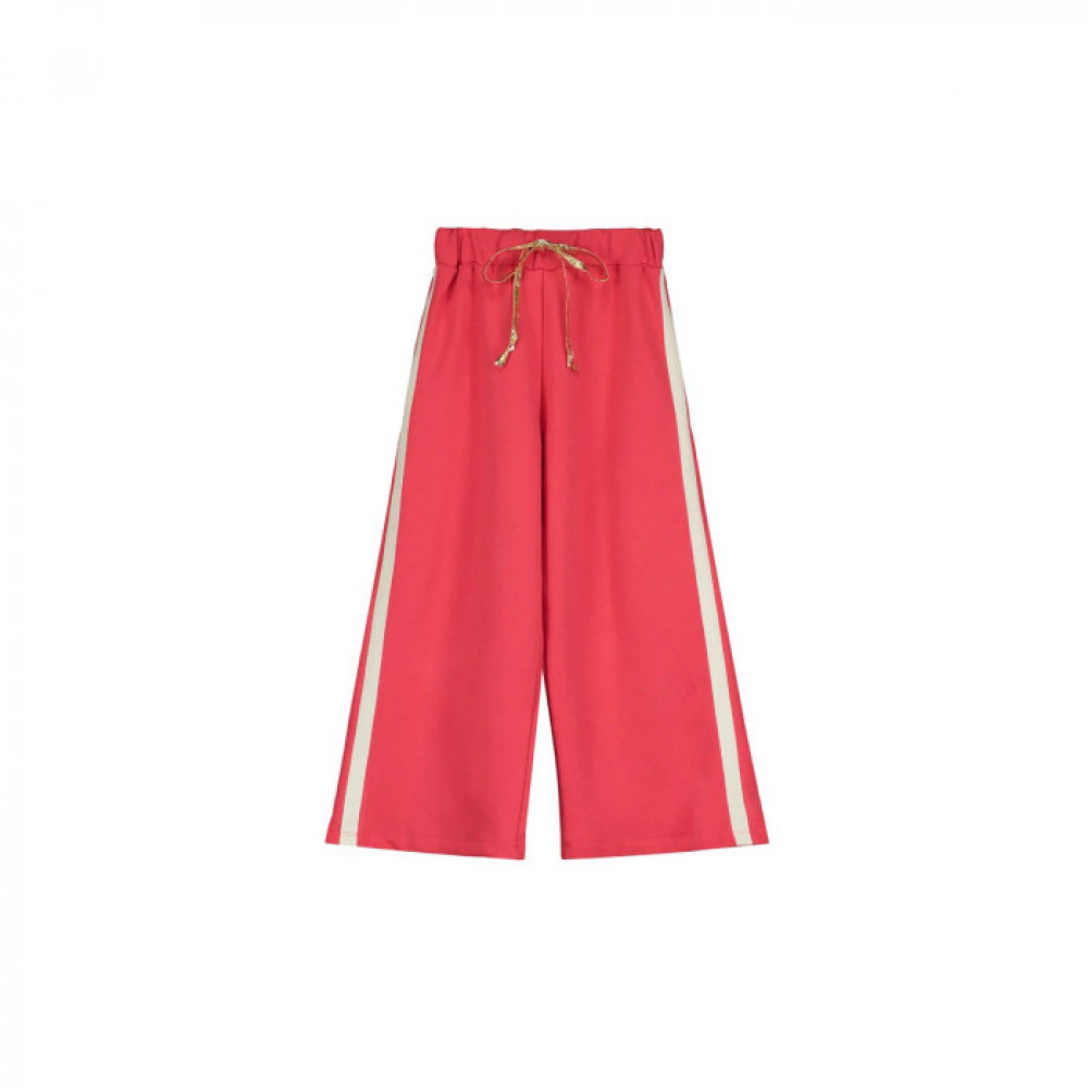Яскраві червоні прямі брюки з однією кремовою смужкою з кожного боку. Зручні з еластичним поясом. Золота паперова стрічка на поясі.