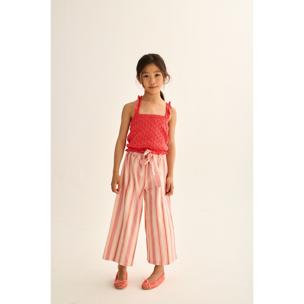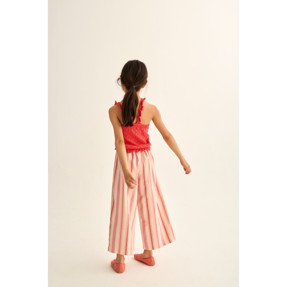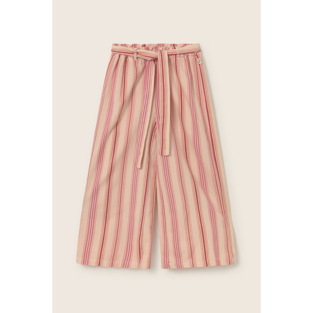 Штани з м'якої та зручної бавовни. Широкий силует з трохи коротшою довжиною до щиколотки. Еластичний пояс зі шлевками для ременя та прикріпленим поясом. Оборки на талії.