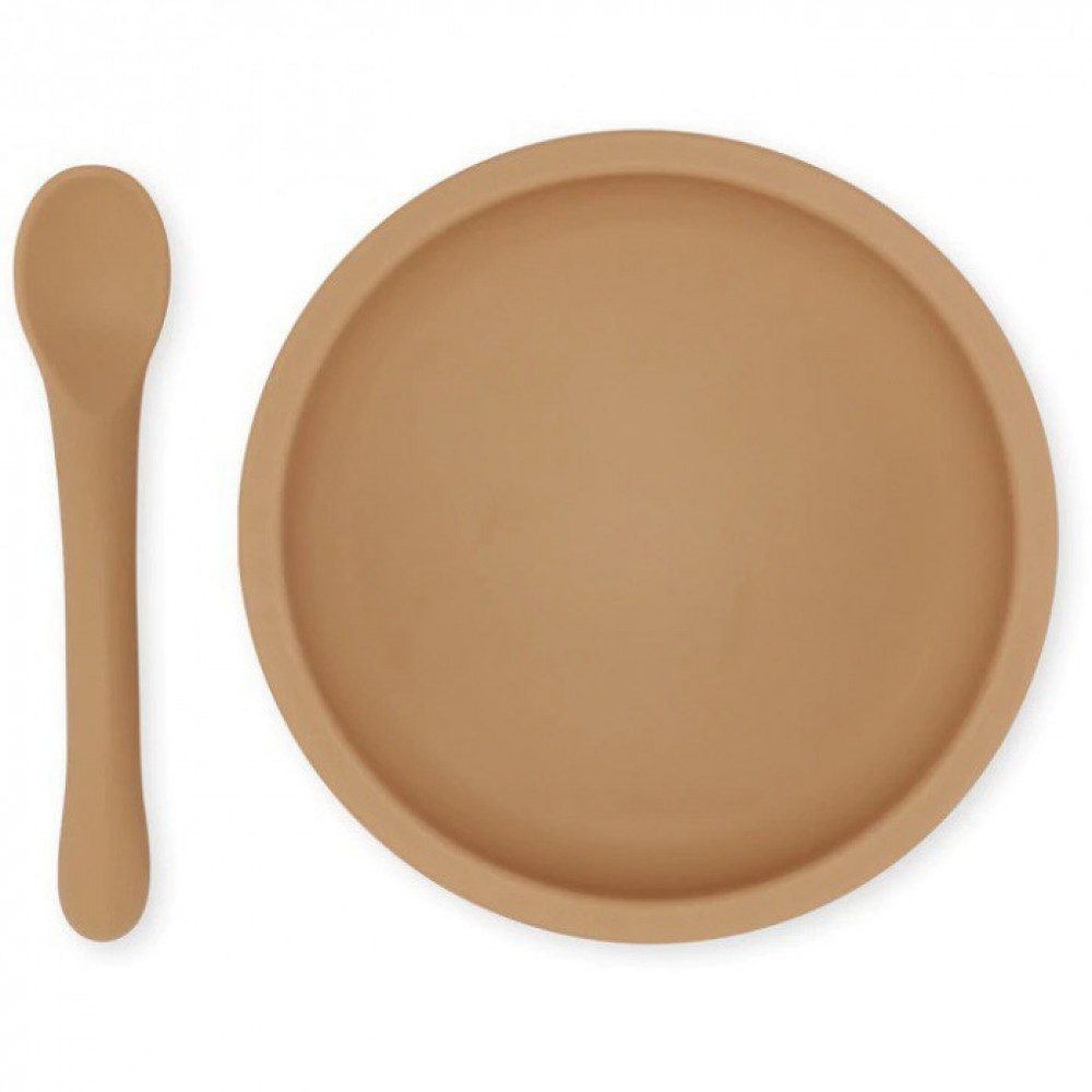 Наш новий силіконовий набір значно полегшує вечерю. Внизу на тарілці присоска, тому вона залишається на столі. Діаметр пластини: 14,5 см Довжина ложки: 14 см