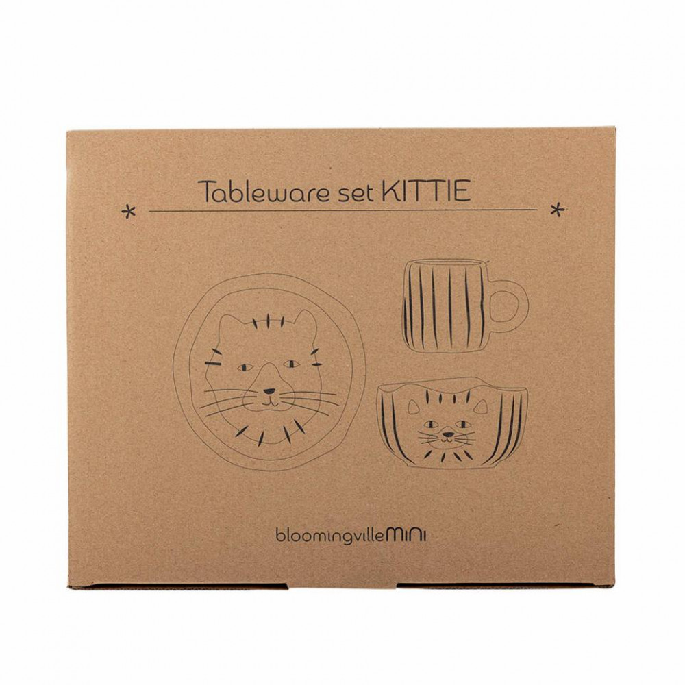Набір посуду Kittie від Bloomingville MINI оздоблений вручну у веселій хвилястій формі з мотивом кота. Милий котик розважає дитину під час вечері. Миска: 320 мл / Чашка: 130 мл C:Г7xВ6,5/Ш:Г11,5xВ7/В:Г15 см, Комплект з 3 штук