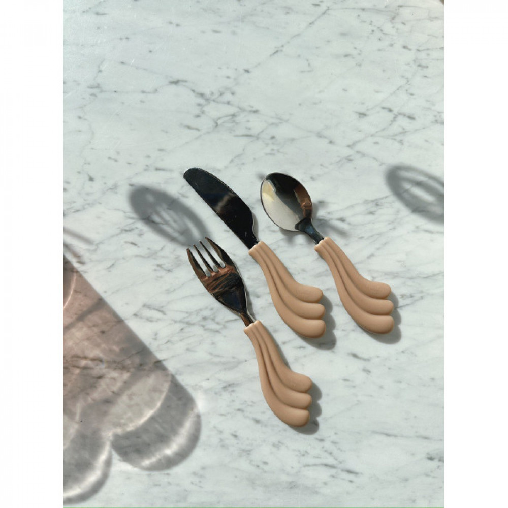 Набір столових приладів, декарованих хвилями. Розміри: Ніж: 14,8 см Вилка: 14,3 см Ложка: 13,5 см Можна мити в посудомийній машині. Не використовуйте в мікрохвильовій печі. 3 роки +
