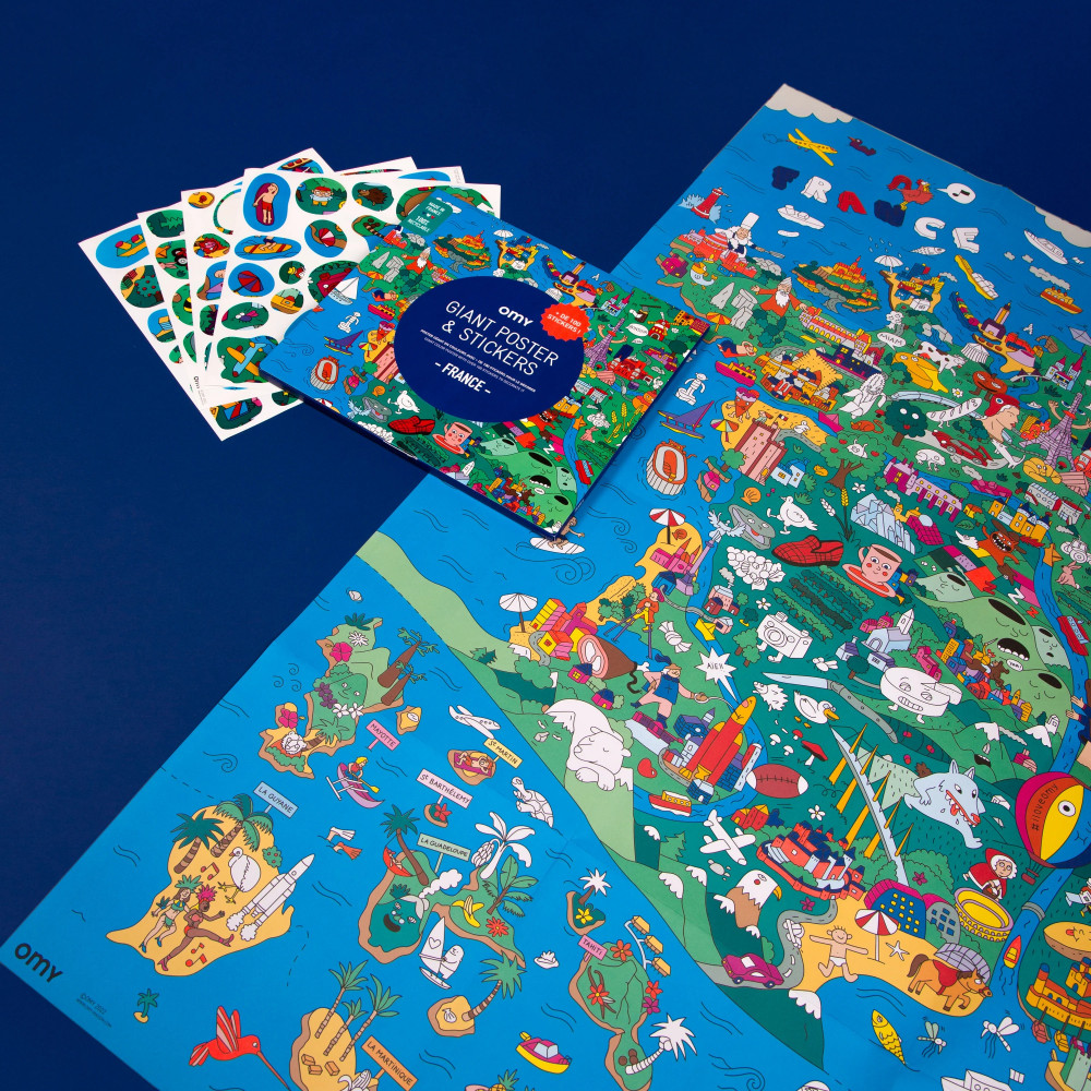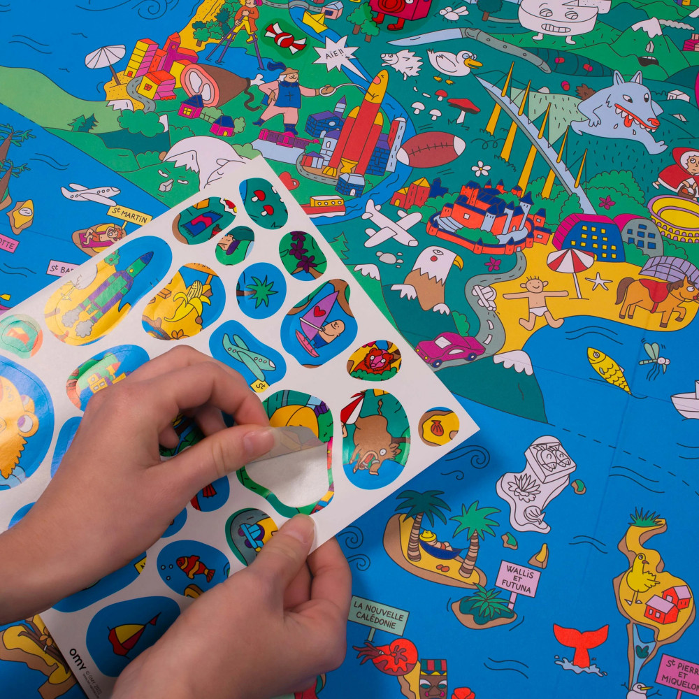 Франція та її заморські території, вид з неба! Розважайтеся з гігантським плакатом «шукай та знаходи»: з понад 100 наліпками для годин розваг. Гігантський плакат «шукай та знаходи», який займе всіх на довгі години! Гумористичний стиль та безліч деталей створюють справжню графічну подорож, якою можна поділитися. Цікаві ілюстрації та неонові кольори!