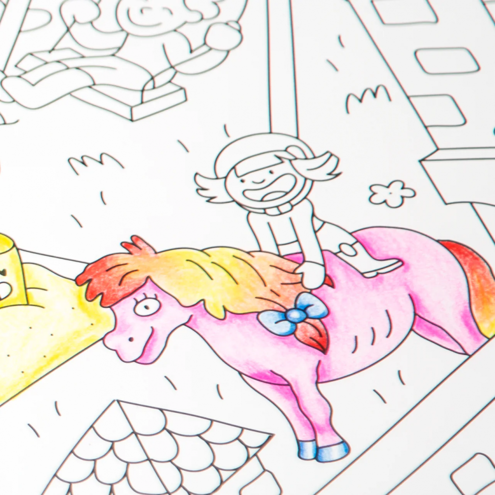 Цей постер, водночас пізнавальний та веселий, зображує міні-світ маленьких дітей: парк, школу та повсякденні справи... З гумористичними рядками та безліччю деталей, це справжня графічна подорож, якою можуть поділитися всі покоління. Безмежний художній простір для розфарбовування самостійно чи з іншими, для розгортання на підлозі, вішання на стіну або використання як скатертини. Вміст: 1 постер. Розмір у розкладеному вигляді: 70 x 100 см.