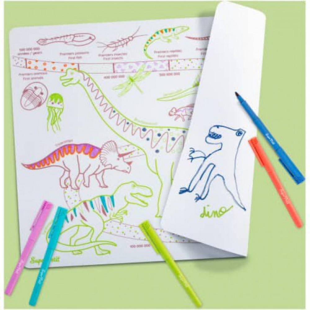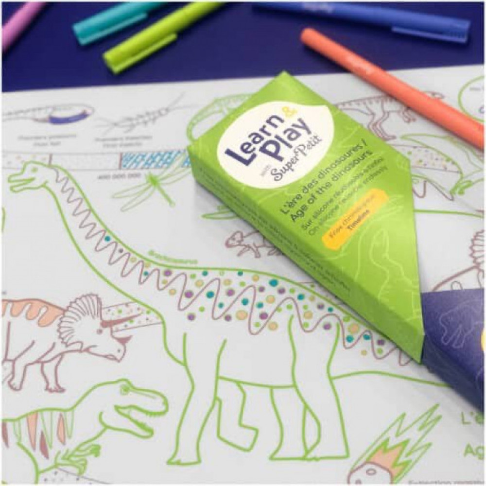 Цей килимок розважить вашу дитину під час їжі. Малюнок з дінозаврами допоможе вашій дитині вивчити Їх різновиди, та дізнатіся цікаві факти з їхнього життя. Цей килимок можна використовувати для захисту столу під час творчих занять, таких як малювання, ліплення з глини, приготування їжі... 1 килимок і 1 маркер (стирається на силіконі). Виготовлений з використанням нетоксичних рослинних барвників. Непористий і антибактеріальний. Без фталатів, без BPA. Довжина: 40 см, ширина: 30 см