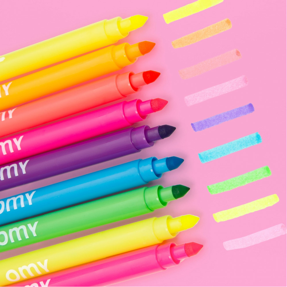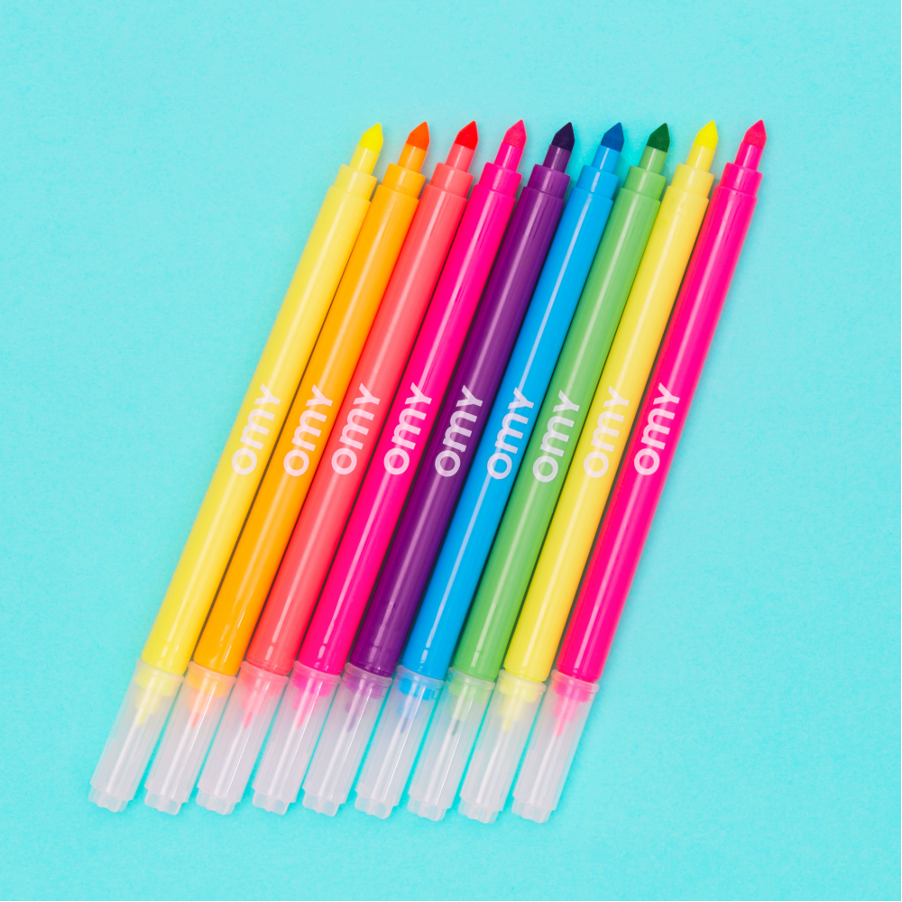 Яскраві кольори: З 6 яскравими неоновими відтінками ваші малюнки випромінюватимуть життя та енергію! Неоново-жовтий (x2), неоново-помаранчевий, неоново-зелений, неоново-фіолетовий, неоново-блакитний, неоново-рожевий (x2)! Практичний подвійний наконечник: Тонкий наконечник для точних деталей та широкий наконечник для плоских кольорових ділянок. Ідеально підходить для всіх типів розфарбовування OMY та багато іншого! Тривалі години розфарбовування: Ці маркери – ваш союзник для нескінченних сеансів розфарбовування. Приготуйтеся дати волю своїй творчості! Практичні та розумні: Коробка трансформується в стильний тримач для олівців, щоб ваші маркери були акуратними та завжди під рукою! Вміст: 1 коробка з 9 маркерами Розроблено у Франції OMY