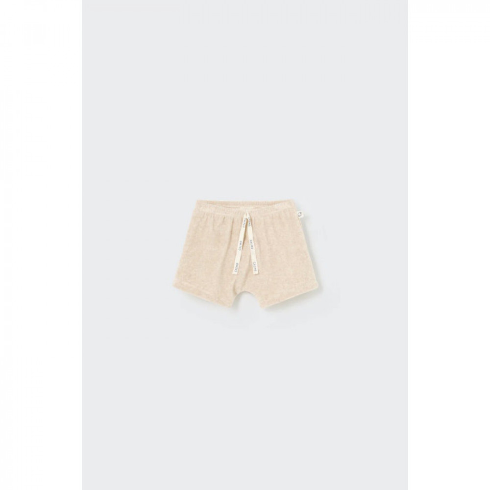 Шорти для немовлят і малюків з пухнастої та зручної тканини з органічної бавовни. Еластичний пояс з декоративною зав'язкою. Ззаду накладна кишеня з контрастної плюшевої тканини.