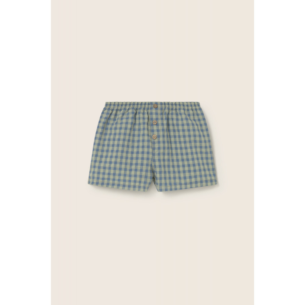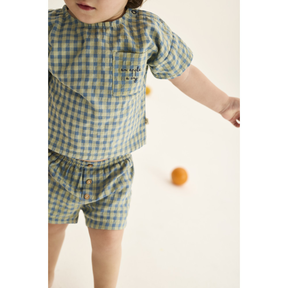 М'які бавовняні шорти зі свіжим та яскравим візерунком у клітинку. Еластичний пояс. Імітація ширинки з декоративними ґудзиками. Накладна кишеня ззаду з вишитим написом «яблуко на день».