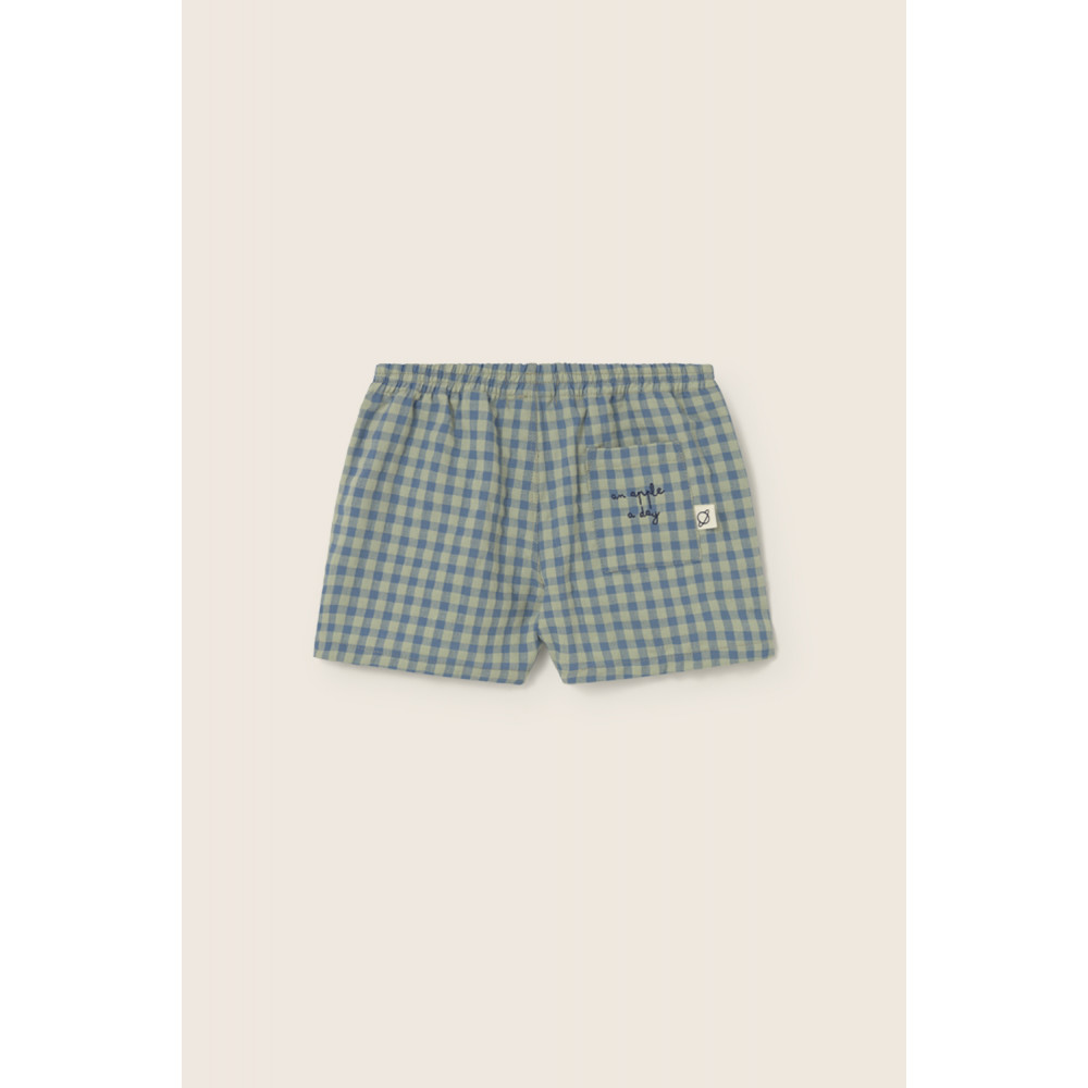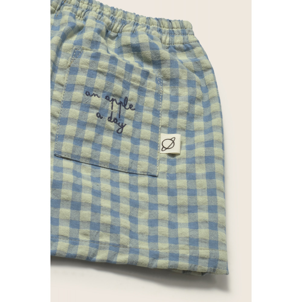 М'які бавовняні шорти зі свіжим та яскравим візерунком у клітинку. Еластичний пояс. Імітація ширинки з декоративними ґудзиками. Накладна кишеня ззаду з вишитим написом «яблуко на день».