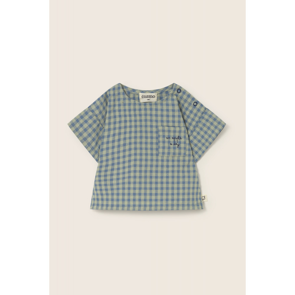 М'який бавовняний топ зі свіжим та яскравим візерунком у клітинку. Круглий виріз горловини з кнопками на одному плечі для зручного одягання. Короткі рукави. Накладна кишеня на грудях з вишитим мотивом — яблуко на день.