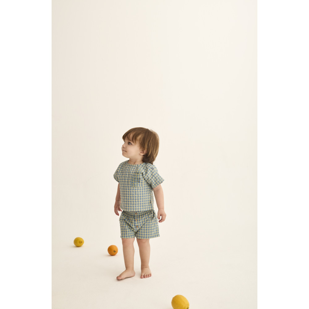 М'який бавовняний топ зі свіжим та яскравим візерунком у клітинку. Круглий виріз горловини з кнопками на одному плечі для зручного одягання. Короткі рукави. Накладна кишеня на грудях з вишитим мотивом — яблуко на день.