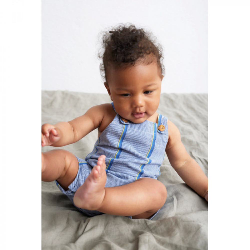 Комбінезон з легкої бавовни з плетеними смугами. Регульовані бретелі із застібкою на гудзики спереду. Кокетка спереду. Бічні накладні кишені зі смугами в горизонтальному положенні. Кнопки на ластовиці.