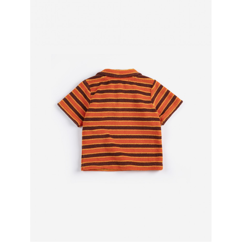 Помаранчева футболка. Короткі рукави, спущені плечі, застібка на ґудзики спереду, нашивка, вільний крій та комір поло.