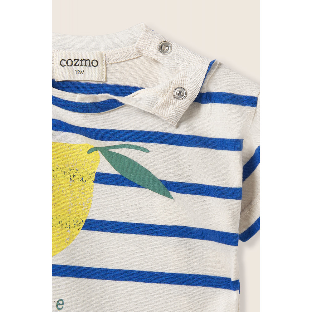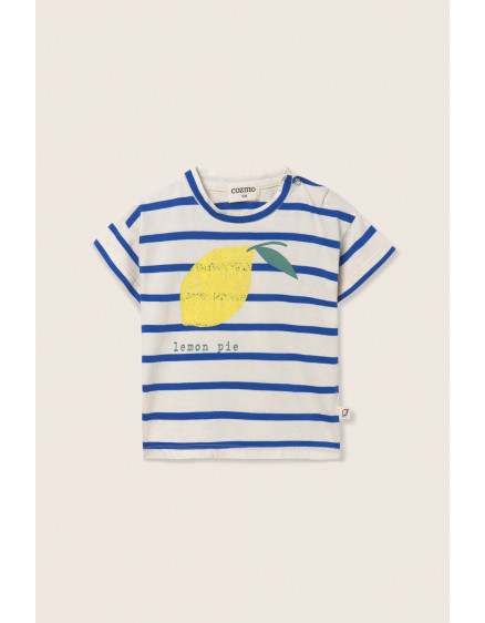 Смугаста футболка з гладенького та дихаючого бавовняного трикотажу. Круглий виріз горловини та застібки на кнопках на плечі для легкого одягання та знімання. Короткі рукави. Друкований мотив із лимоном та написом «лимонний пиріг».