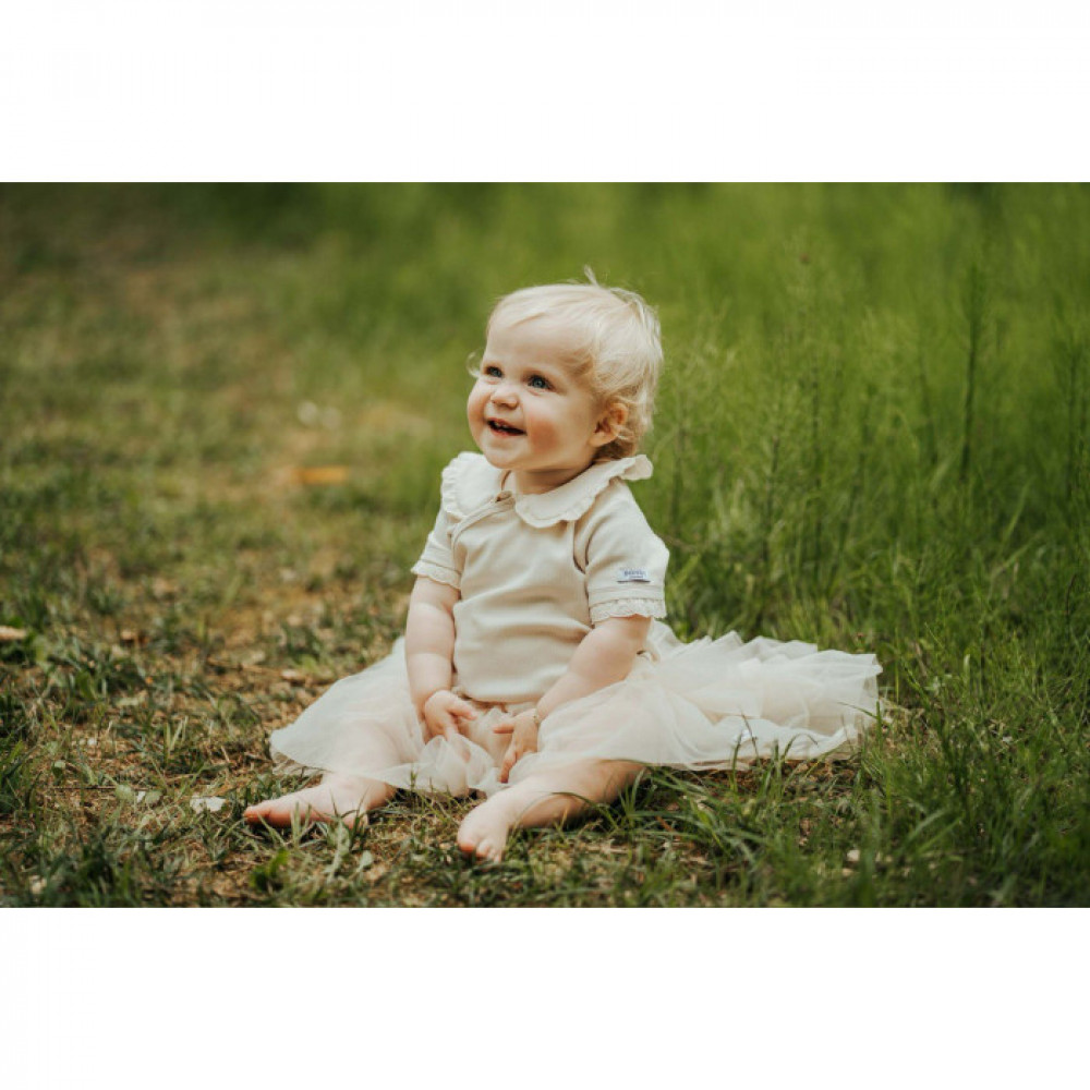 Боді з комірцем та короткими рукавами. Застібки знизу для зручного одягання.