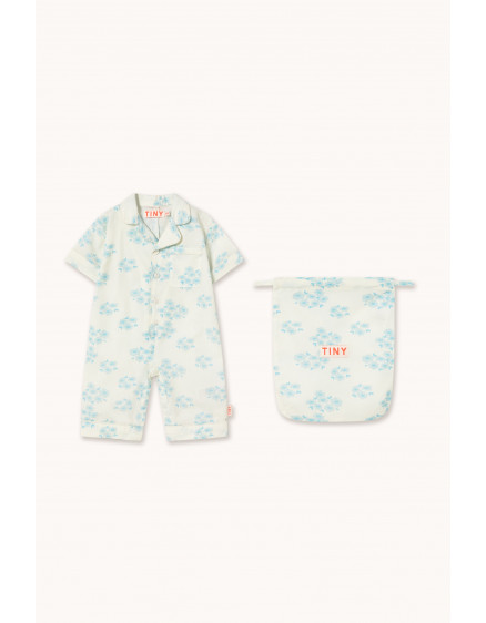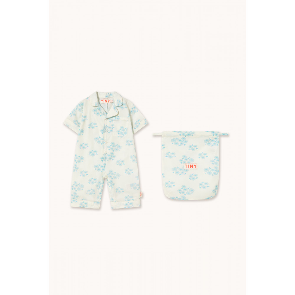 Цей суцільний одяг з принтом «Квітки» виготовлений зі 100% бавовни та має вільний, зручний силует. Він має короткі рукави, невелику нагрудну кишеню спереду, застібку на ґудзики спереду та кнопки знизу для зручного одягання. Також до нього додається сумка, що ідеально підходить для зберігання одягу.