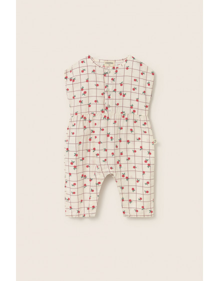 Комбінезон без рукавів з легкого бавовняного попліну з веселим фруктовим принтом та ніжною текстурою "слаб". Круглий виріз горловини з ґудзиками спереду. Зібраний на талії. Застібаються на кнопки вздовж штанин.