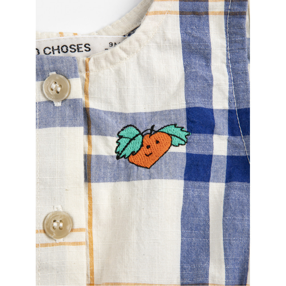 Безрукавний, із застібкою на ґудзики спереду, еластичним низом, еластичним поясом, вишивкою, круглим вирізом та вільним кроєм.