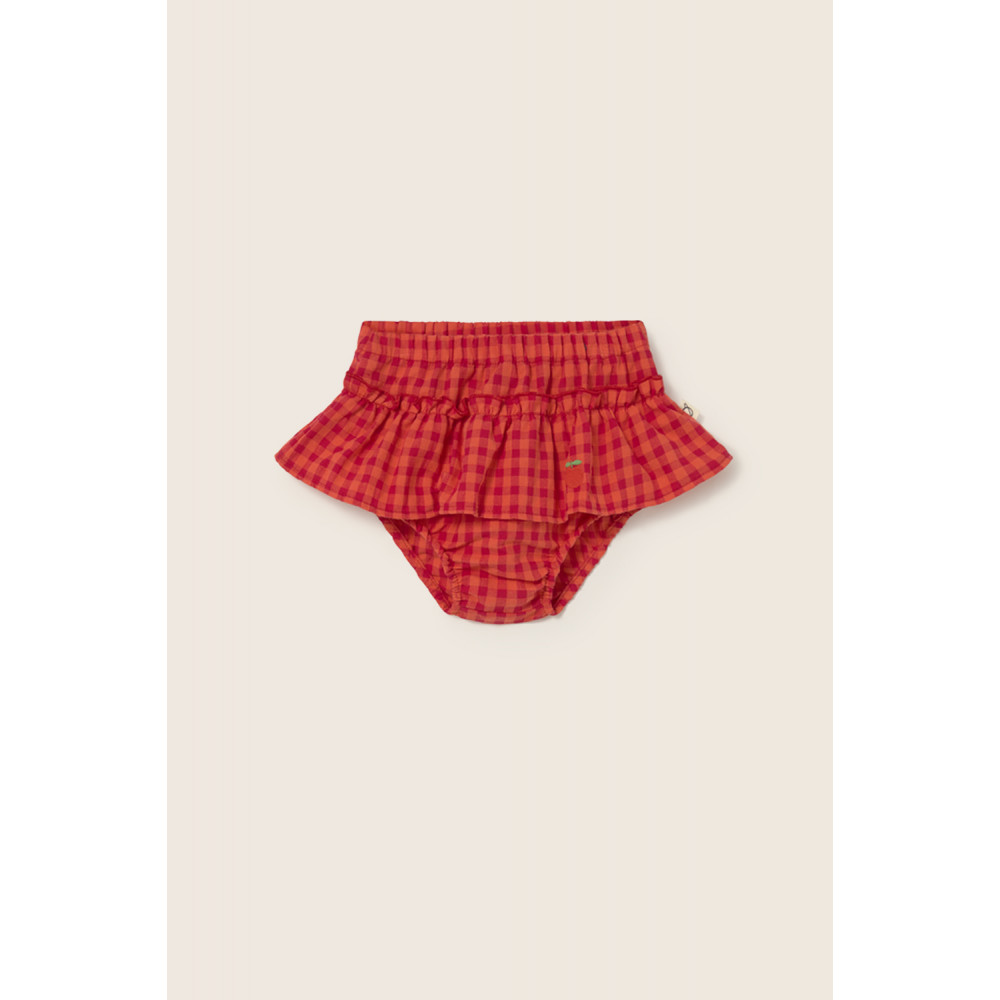 М'які бавовняні панталони зі свіжим та яскравим візерунком у клітинку. Еластичний пояс та отвори для штанин. Верхня спідниця з рюшами та вишитим мотивом яблука.