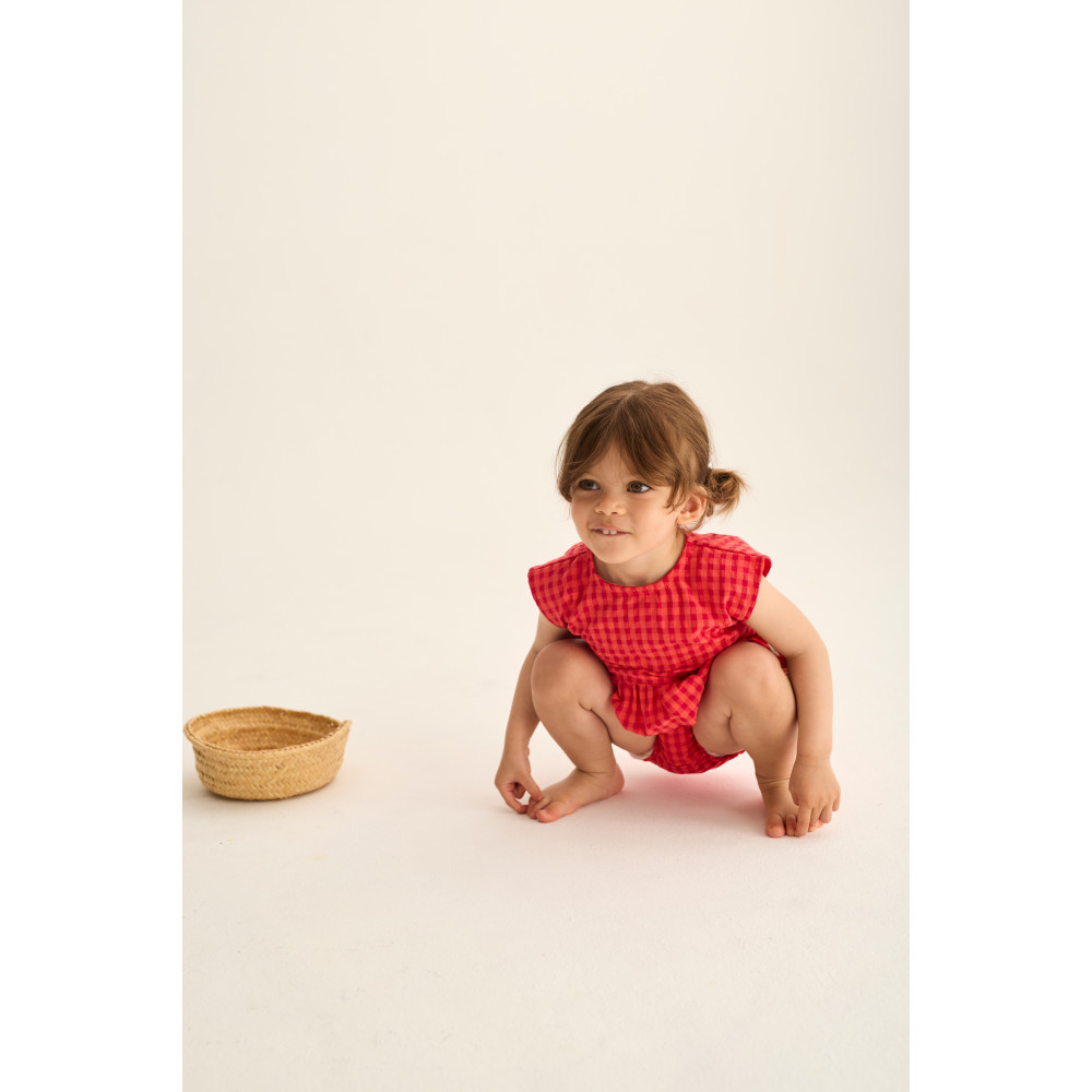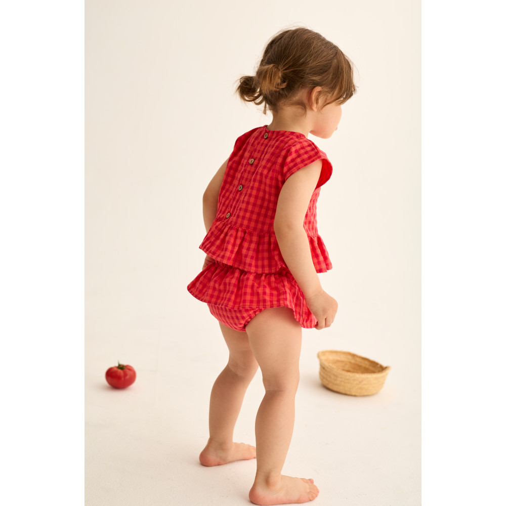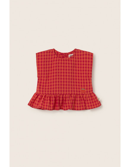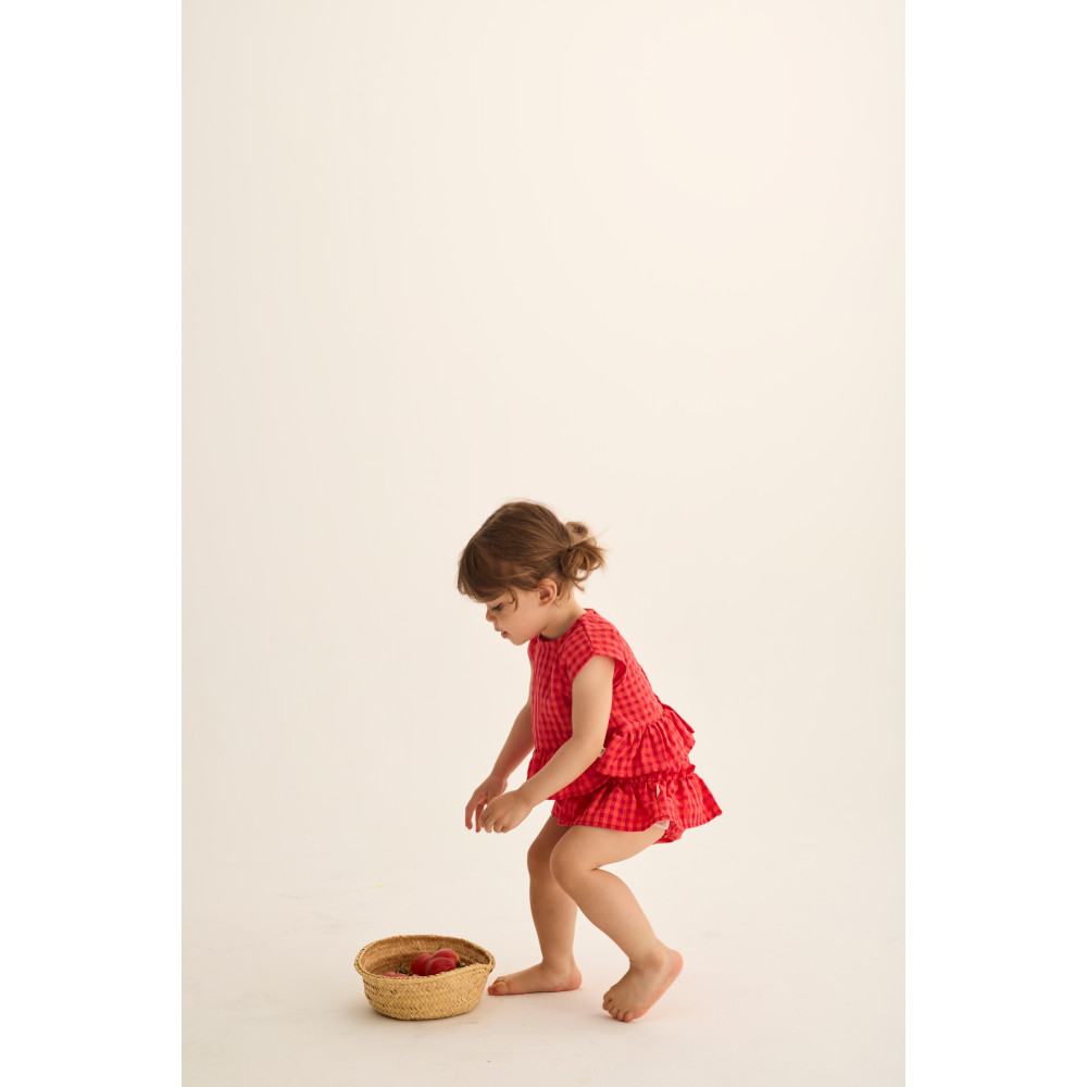 М'який бавовняний топ у свіжий та яскравий візерунок у клітинку. Круглий виріз горловини та застібка на ґудзики ззаду. Без рукавів. Зібраний подол з воланами. Вишита деталь з яблуком спереду.