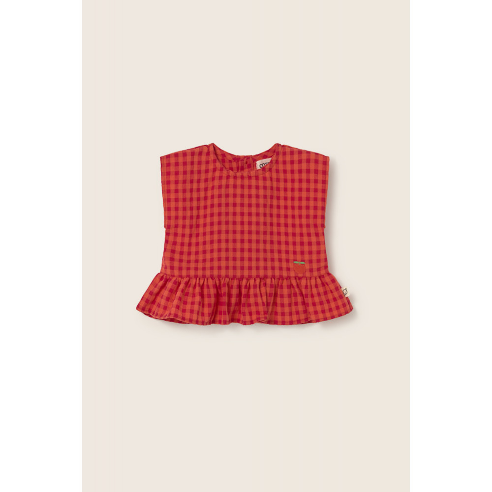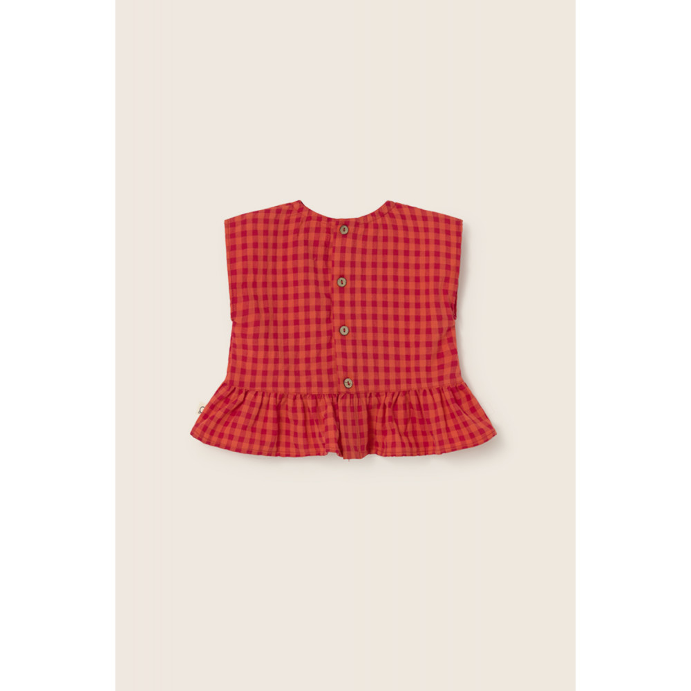 М'який бавовняний топ у свіжий та яскравий візерунок у клітинку. Круглий виріз горловини та застібка на ґудзики ззаду. Без рукавів. Зібраний подол з воланами. Вишита деталь з яблуком спереду.