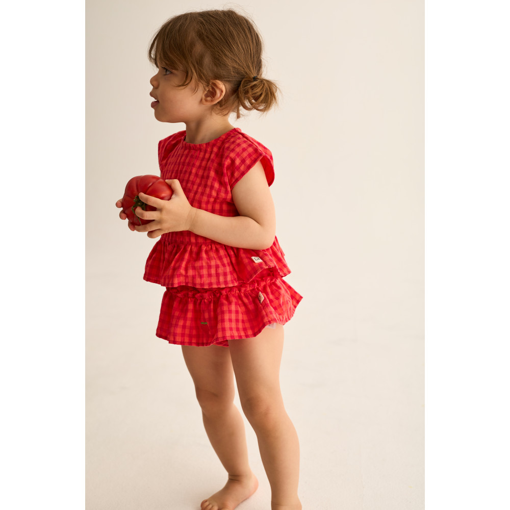 М'який бавовняний топ у свіжий та яскравий візерунок у клітинку. Круглий виріз горловини та застібка на ґудзики ззаду. Без рукавів. Зібраний подол з воланами. Вишита деталь з яблуком спереду.