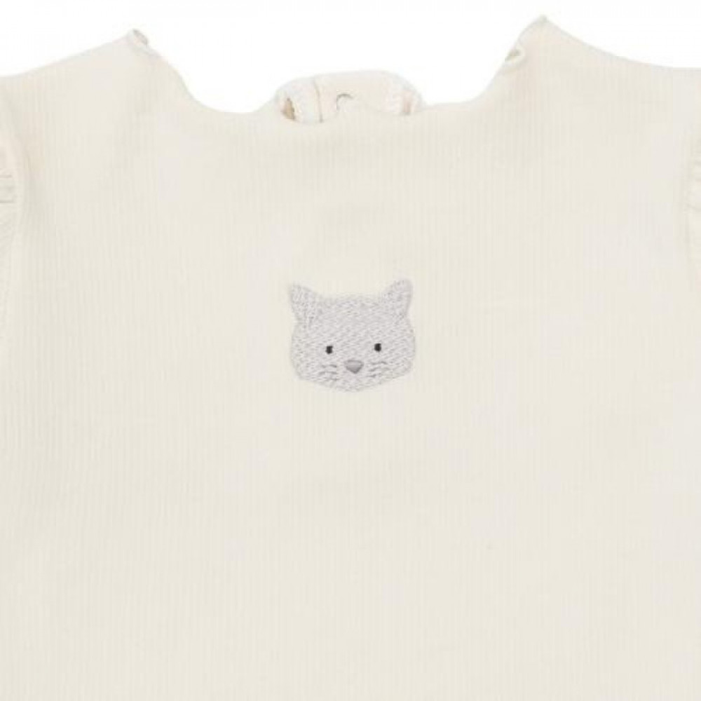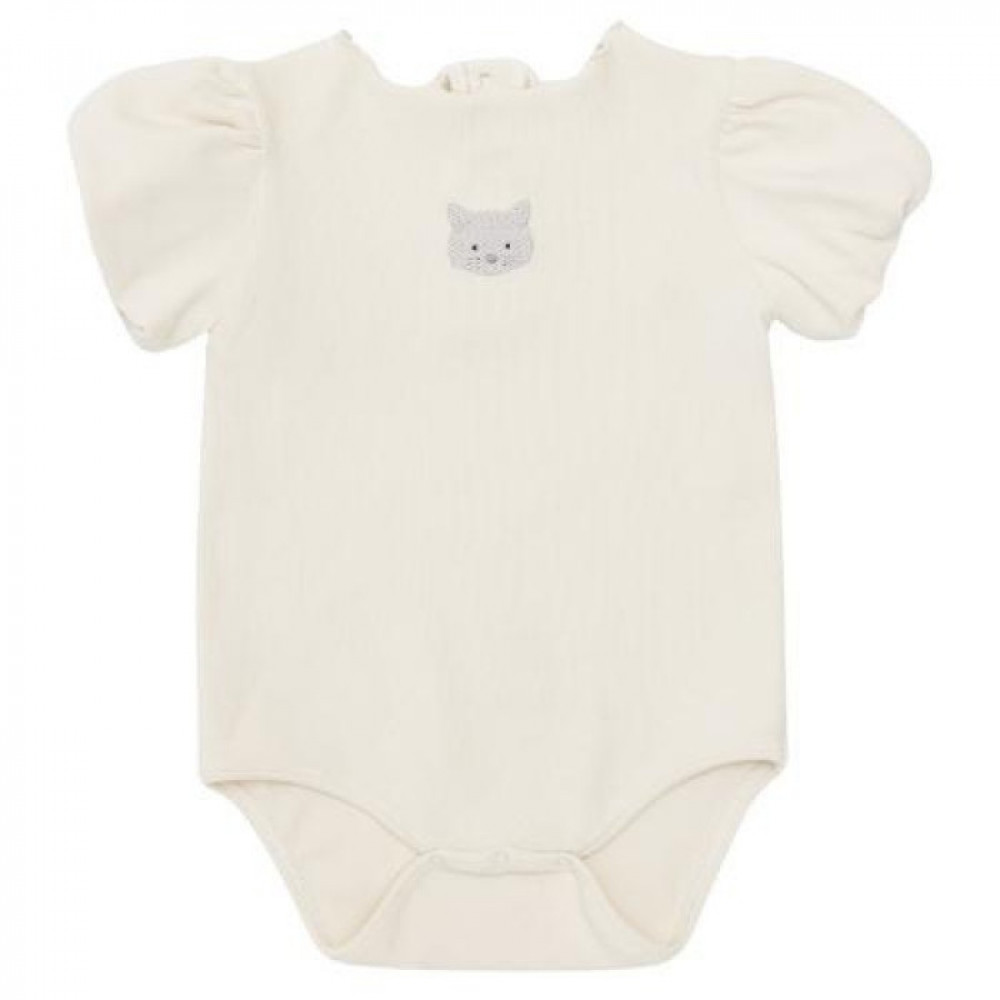 Цей гарний боді з короткими рукавами виконаний у тепло-білому кольорі та має вишиту мордочку кота на грудях. Має круглу горловину, плісировані рукави та тканину, красиво підвернуту всередину на кінцях рукавів, що створює гарний ефект.