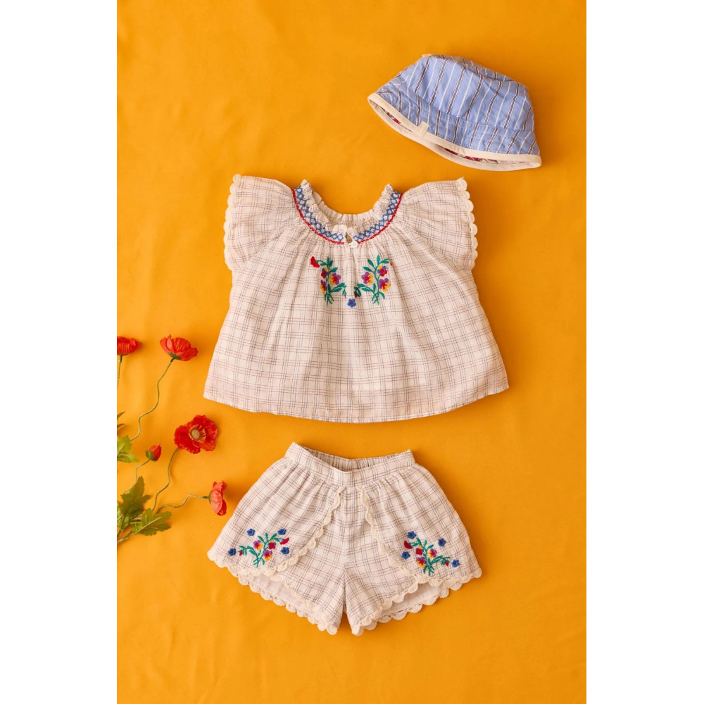 Цей дитячий комплект складається з блузки Perla та шортів Asya. Картаті шорти з фарбованої бавовняної тканини. Картата блузка з фарбованої бавовняної тканини.