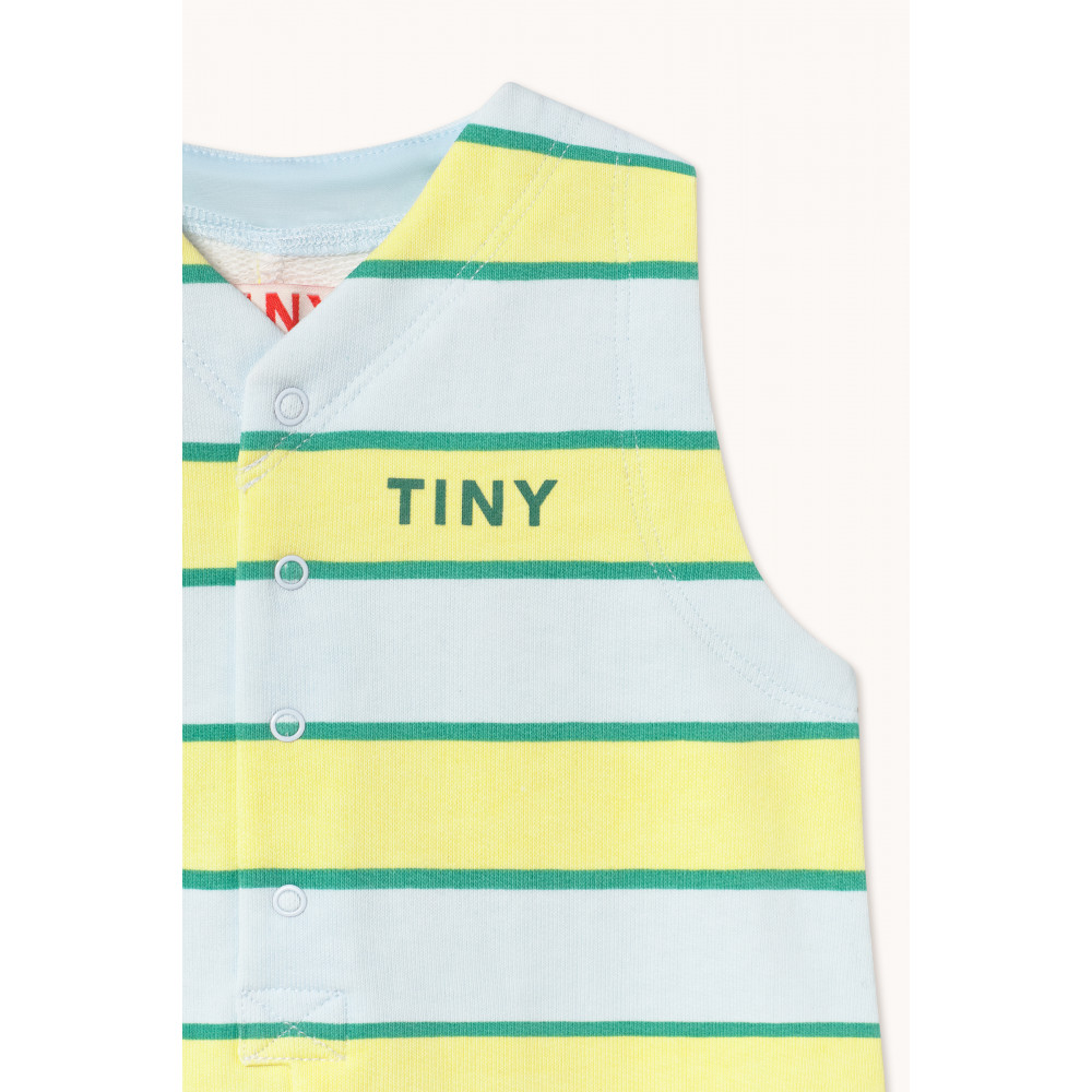 Цей комбінезон з ретро-смугастим принтом по всій поверхні виготовлений зі 100% органічної бавовни, яка добре пропускає повітря. Він має зручний, вільний силует з V-подібним вирізом горловини та застібками на кнопках спереду та знизу.
