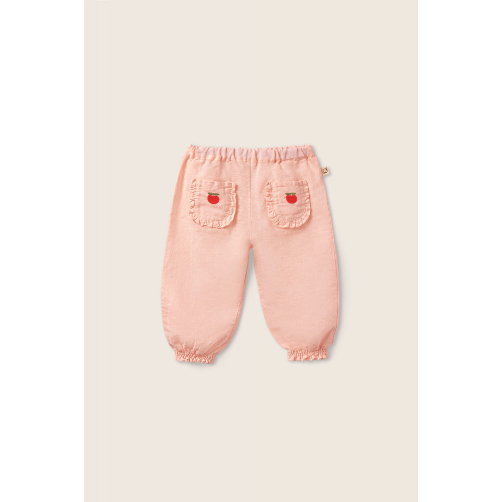 Штани з повітропроникної суміші бавовни та льону. Еластичний регульований пояс. Манжети з принтом. Накладні кишені спереду з вишитим яблуком.
