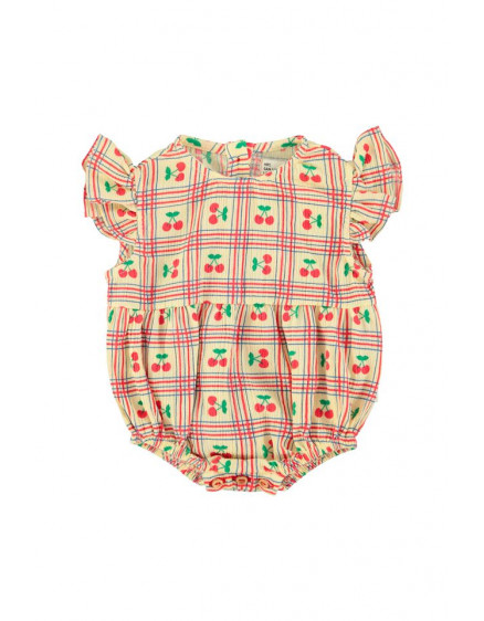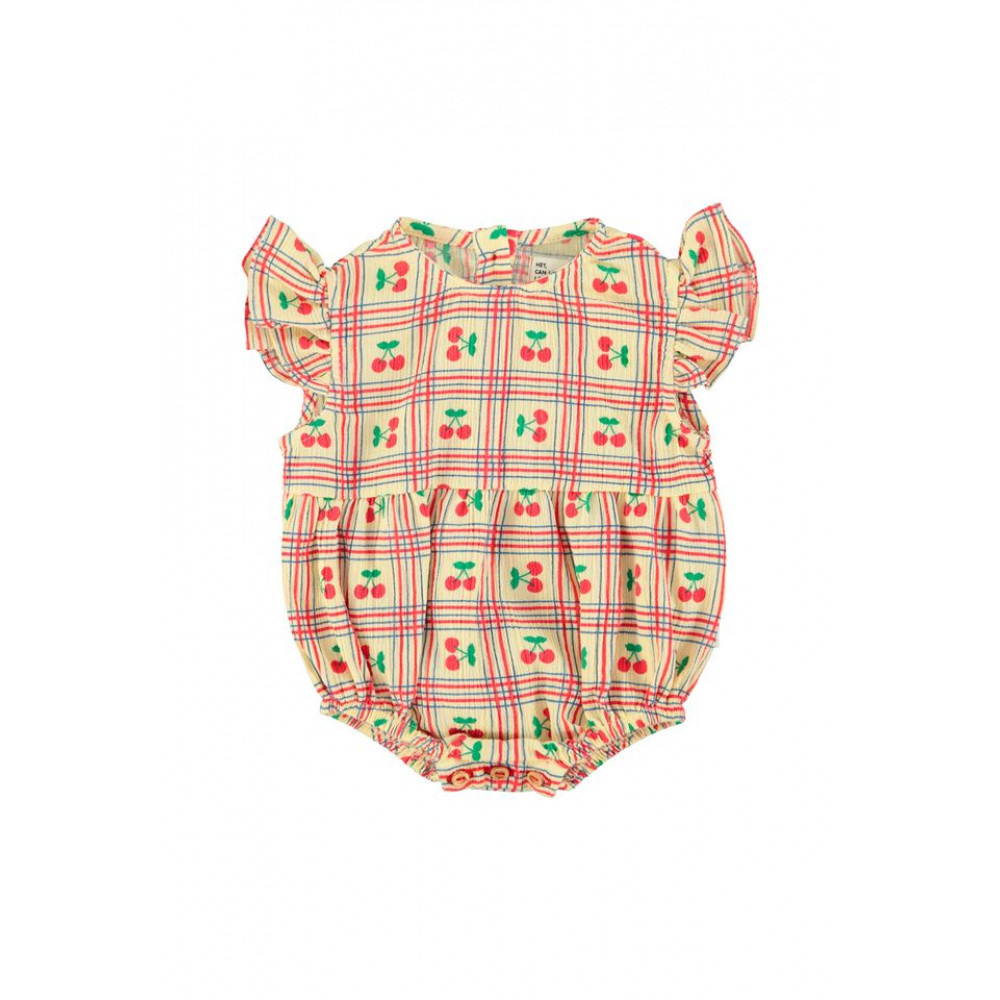 Дитячий комбінезон без рукавів з круглим вирізом горловини та рюшами на плечах. Гумка на стегнах. Застібається на ґудзики між ніжками. Дерев'яні ґудзики ззаду.
