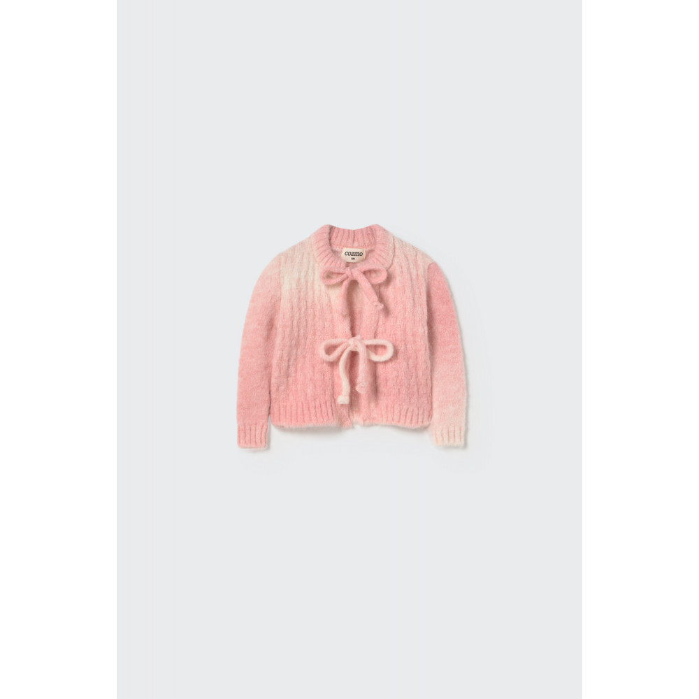 Кардиган для дівчинки з м'якої, пухнастої вовняної тканини та переробленого поліаміду з косами. Має округлий виріз горловини, ребристу горловину, манжети та поділ. Спереду зав'язки з бантами з фланелевої тканини