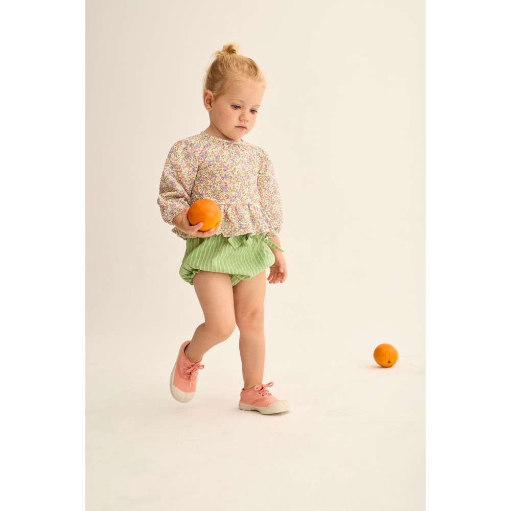 Смугасті панталони з бавовняної тканини з текстурою, що імітує льон. Облямований пояс та вирізи для штанин. Бант спереду.