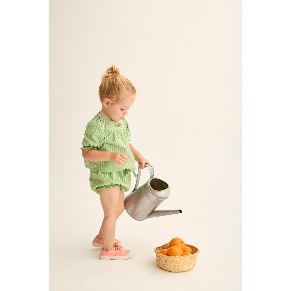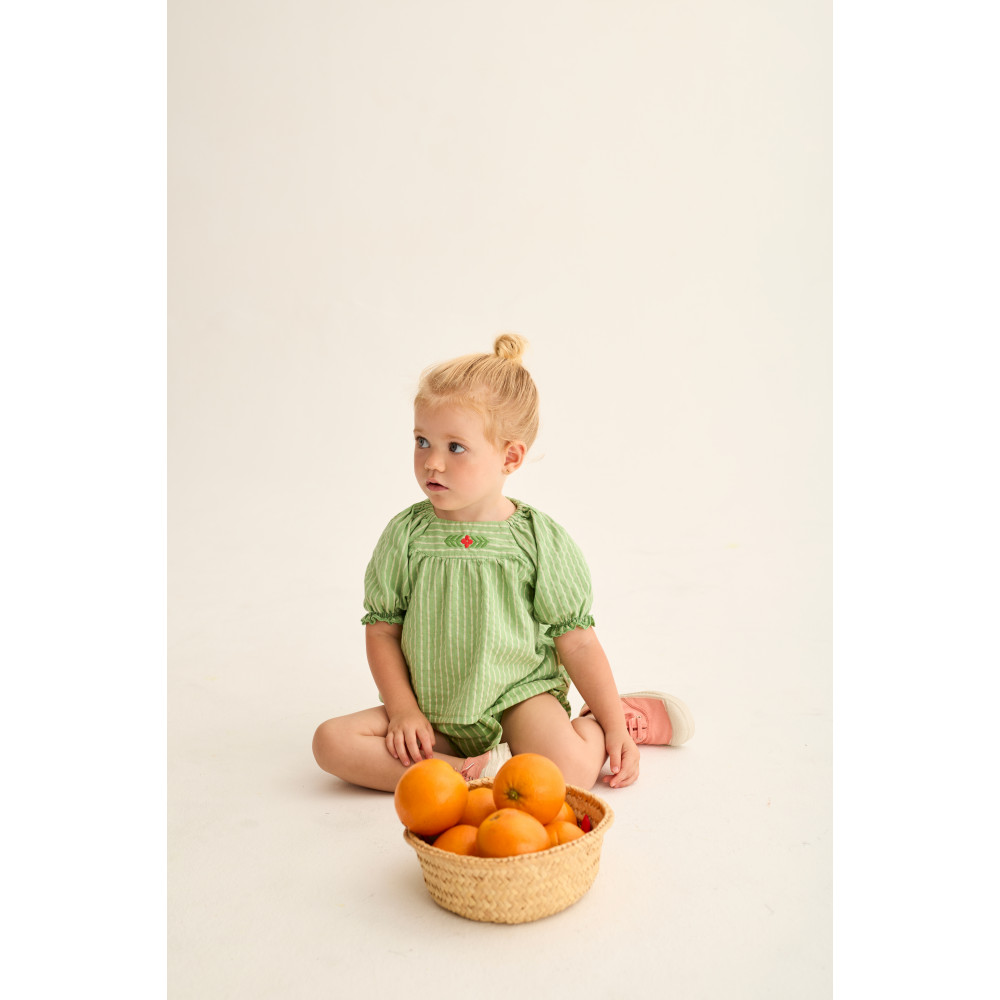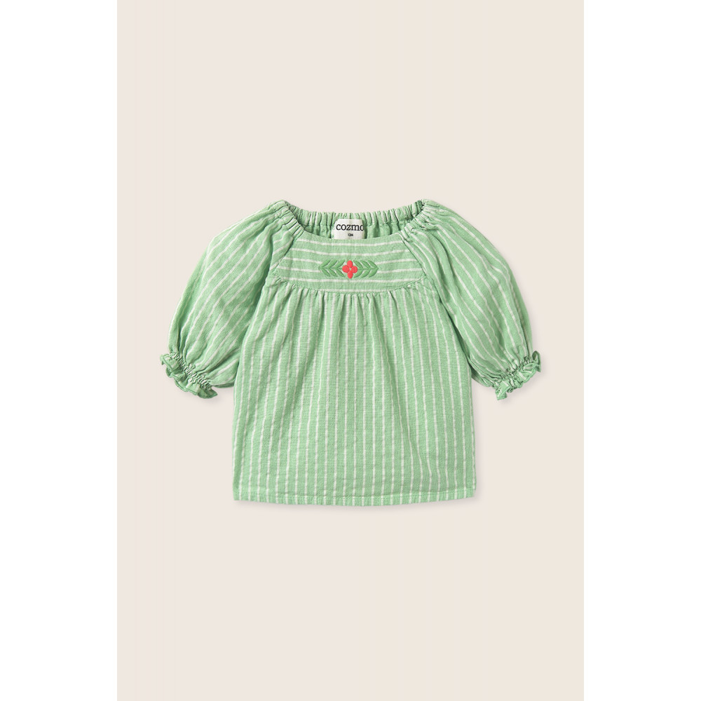 Смугаста блузка з бавовняної тканини з лляною текстурою. Круглий виріз горловини. Короткі рукави реглан. Еластична кокетка на вирізі горловини та манжетах. Закруглена кокетка спереду з квітковою вишивкою.