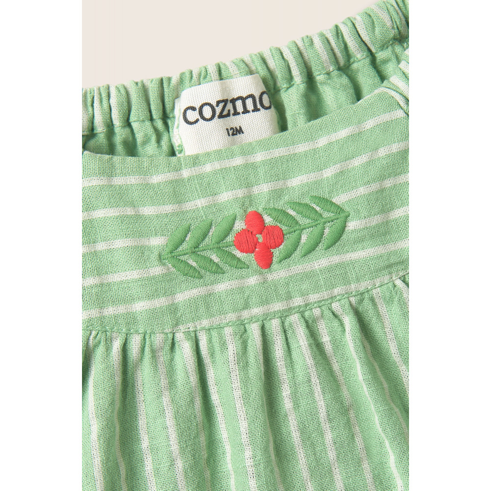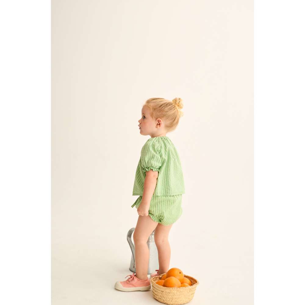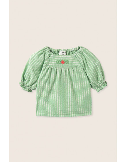 Смугаста блузка з бавовняної тканини з лляною текстурою. Круглий виріз горловини. Короткі рукави реглан. Еластична кокетка на вирізі горловини та манжетах. Закруглена кокетка спереду з квітковою вишивкою.