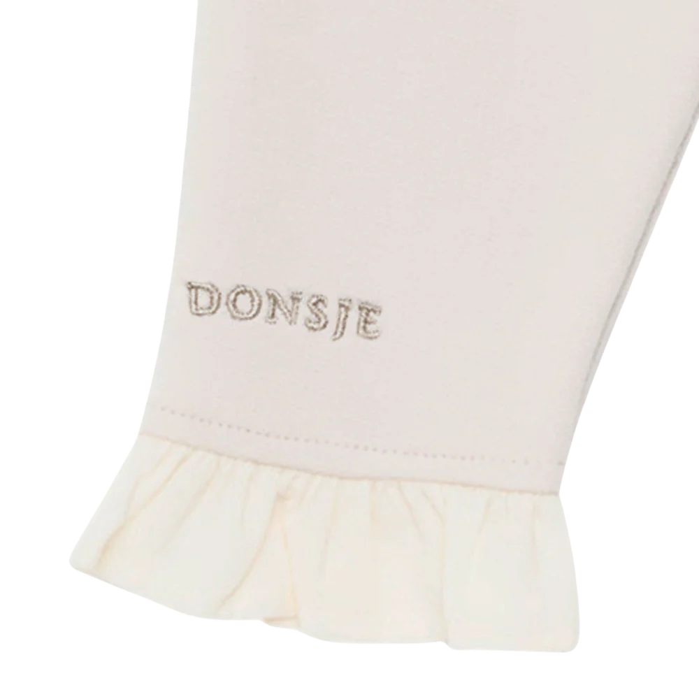 Комфорт зустрічається зі стилем! Зустрічайте невід'ємний елемент міні-гардероба: штани Suzein. Виготовлені з м'якого, щільного матеріалу з еластичним поясом для підвищеного комфорту, ці чарівні штани мають ніжні рюші по краю та вишитий логотип Donsje.