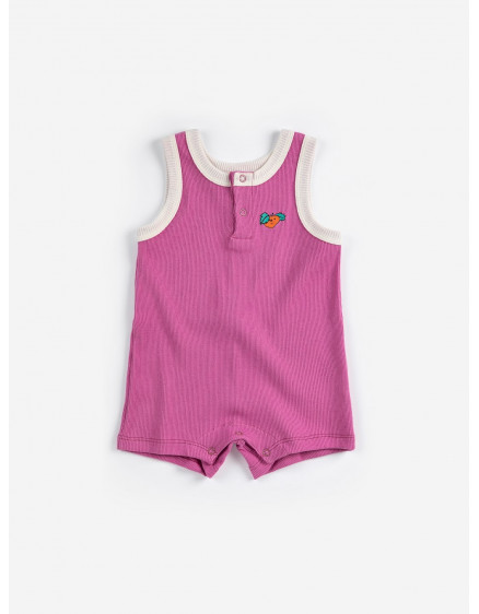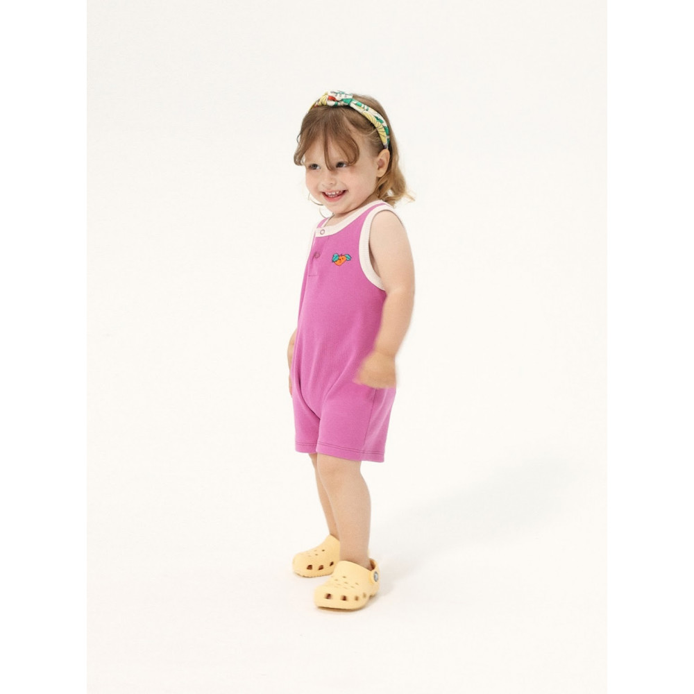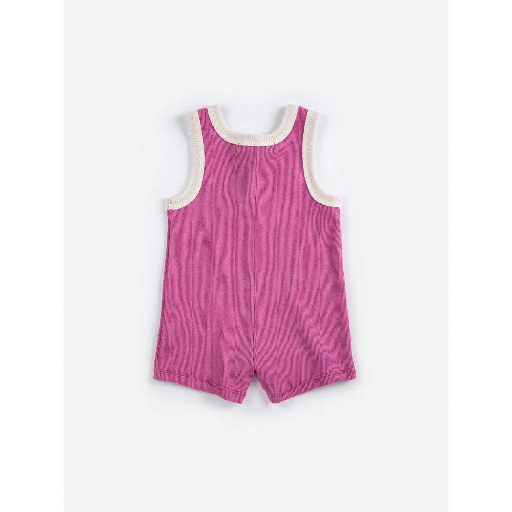 Комбінезон кольору фуксії. Без рукавів, застібка на кнопки спереду, застібка на кнопки в промежині, вишивка, вільний крій, довжина вище коліна та круглий виріз горловини. Виготовлено в Іспанії.