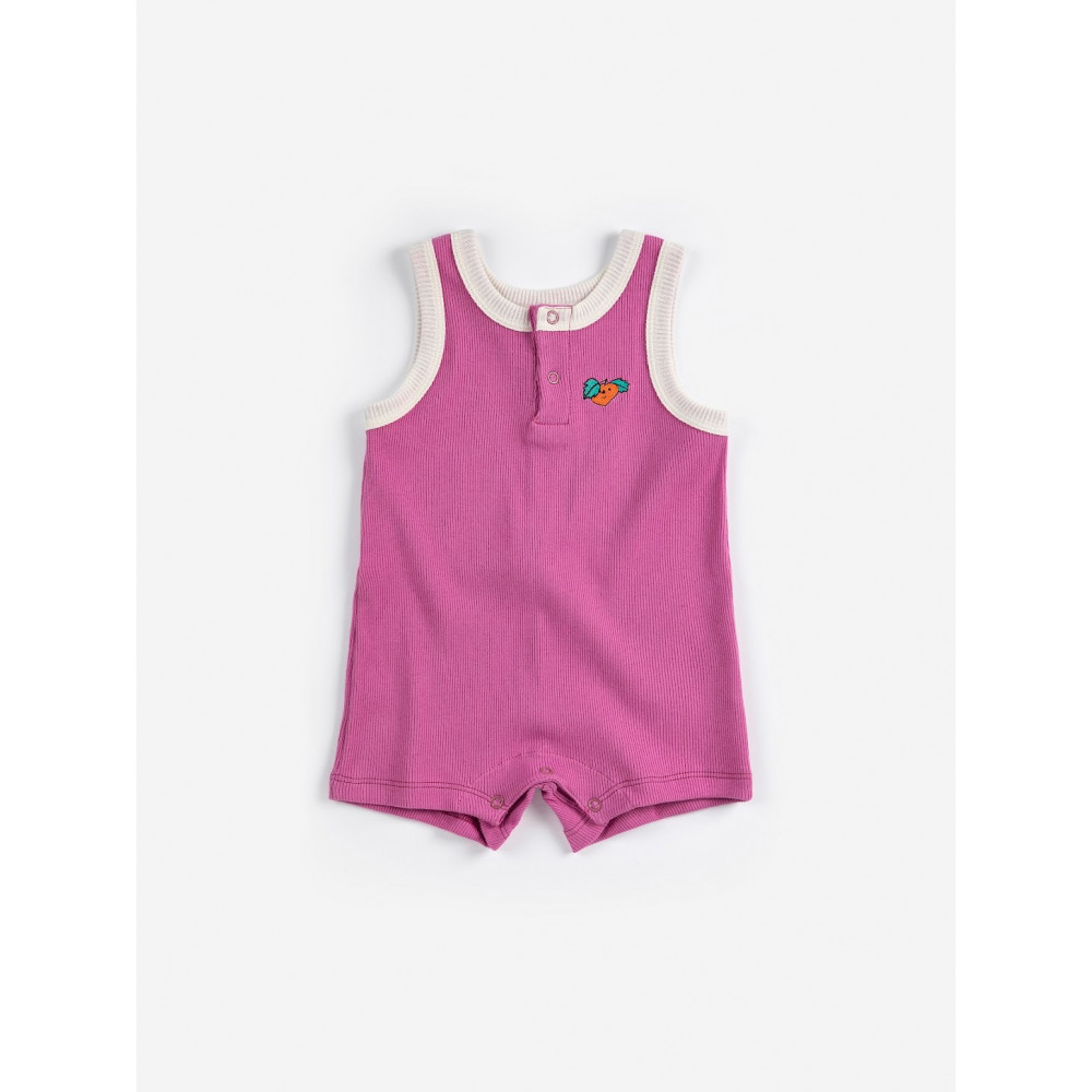 Комбінезон кольору фуксії. Без рукавів, застібка на кнопки спереду, застібка на кнопки в промежині, вишивка, вільний крій, довжина вище коліна та круглий виріз горловини. Виготовлено в Іспанії.