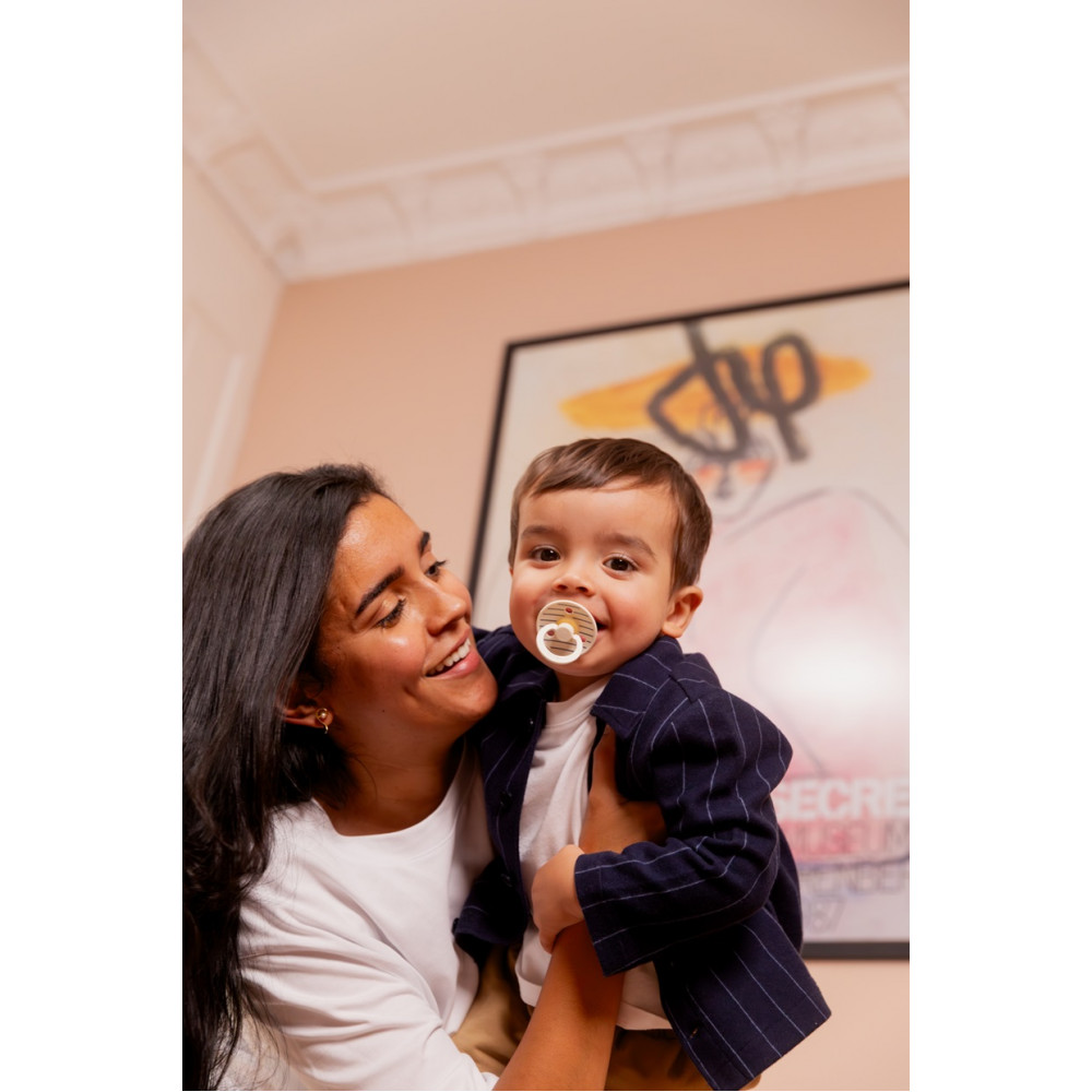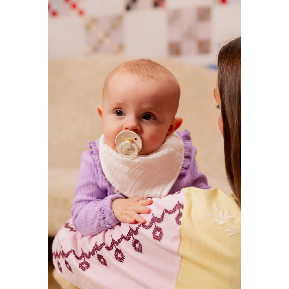 BIBS Colour — це оригінальна пустушка BIBS, яка існує на ринку вже понад 40 років. Анатомічна соска розроблена як ідеальне поєднання круглої та симетричної соски. Кругла зверху для підтримки природного смоктального рефлексу та плоска знизу для зручного розміщення. Техніка смоктання не вимагає такої сили, як, наприклад, кругла пустушки. Пустушка Colour має фірмовий круглий щиток BIBS із трьома вентиляційними отворами та кругле кільце ручки з гравіюванням BIBS. Щиток ретельно розроблений таким чином, щоб закрити чутливу та делікатну шкіру навколо рота дитини, щоб запобігти накопиченню вологи. Щиток поставляється в одному розмірі незалежно від розміру соска.