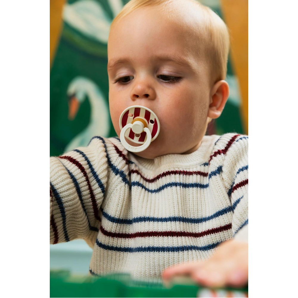 BIBS Colour — це оригінальна пустушка BIBS, яка існує на ринку вже понад 40 років. Анатомічна соска розроблена як ідеальне поєднання круглої та симетричної соски. Кругла зверху для підтримки природного смоктального рефлексу та плоска знизу для зручного розміщення. Техніка смоктання не вимагає такої сили, як, наприклад, кругла пустушки. Пустушка Colour має фірмовий круглий щиток BIBS із трьома вентиляційними отворами та кругле кільце ручки з гравіюванням BIBS. Щиток ретельно розроблений таким чином, щоб закрити чутливу та делікатну шкіру навколо рота дитини, щоб запобігти накопиченню вологи. Щиток поставляється в одному розмірі незалежно від розміру соска.