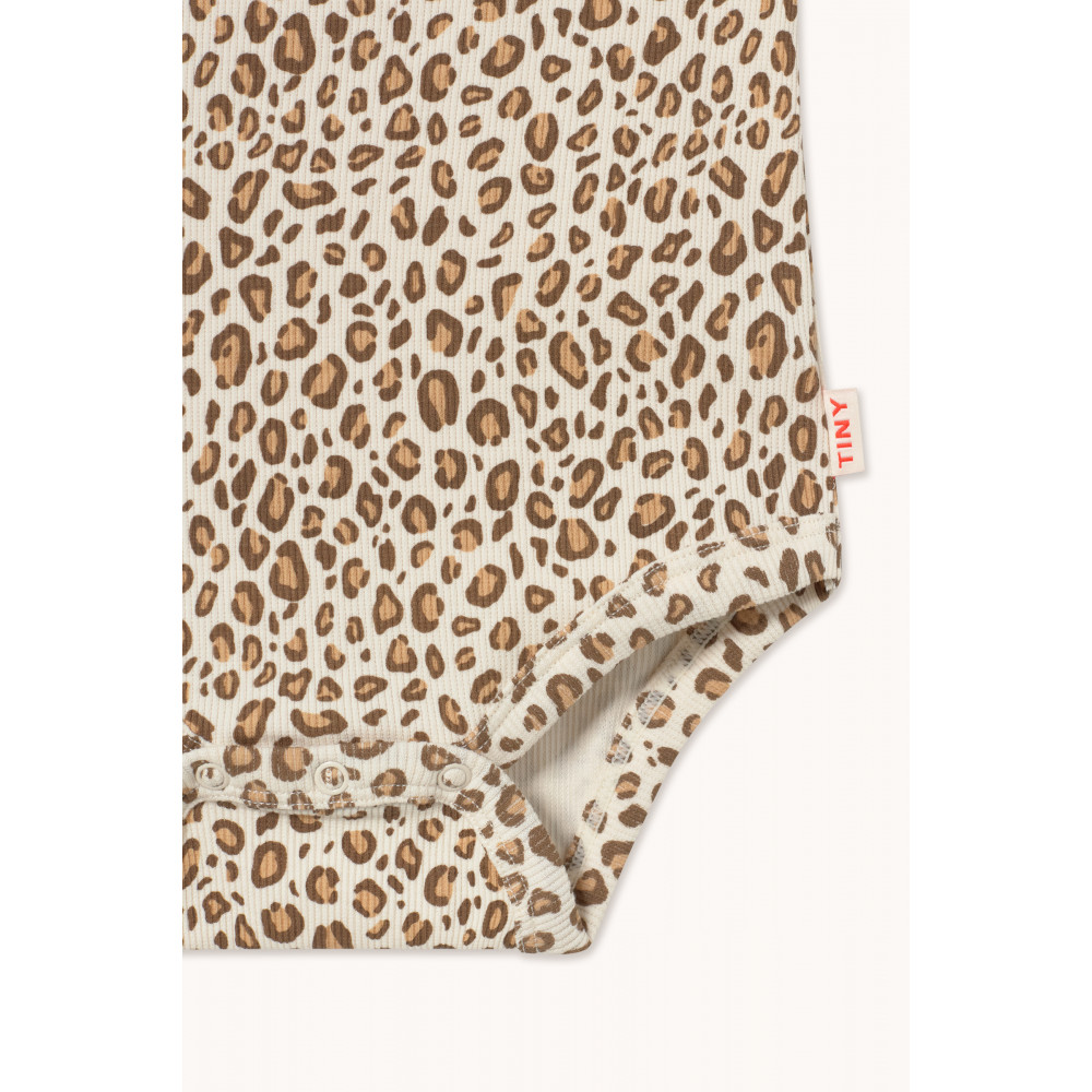 Цей боді з анімалістичним принтом у ребристу тканину виготовлений з м'якої бавовняної суміші, яка дихає. Він має зручний, вільний силует з бретелями та застібкою на кнопці знизу.